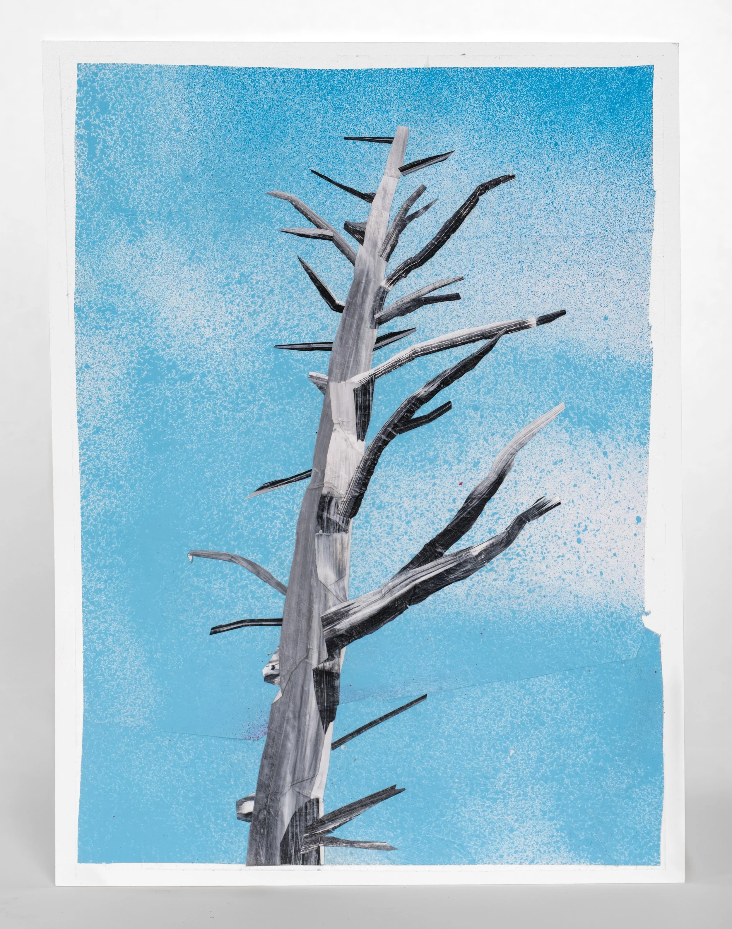 Dead Trees and Other Pretty Things continues Harris’s ongoing exploration of collage as a painterly language rooted in the transformation of everyday materials. Each work begins with hand-painted paper – cut, torn, and reassembled – creating layered compositions where structure and spontaneity coexist. The surface becomes a record of actions: painting, cutting, arranging, revising and layering.